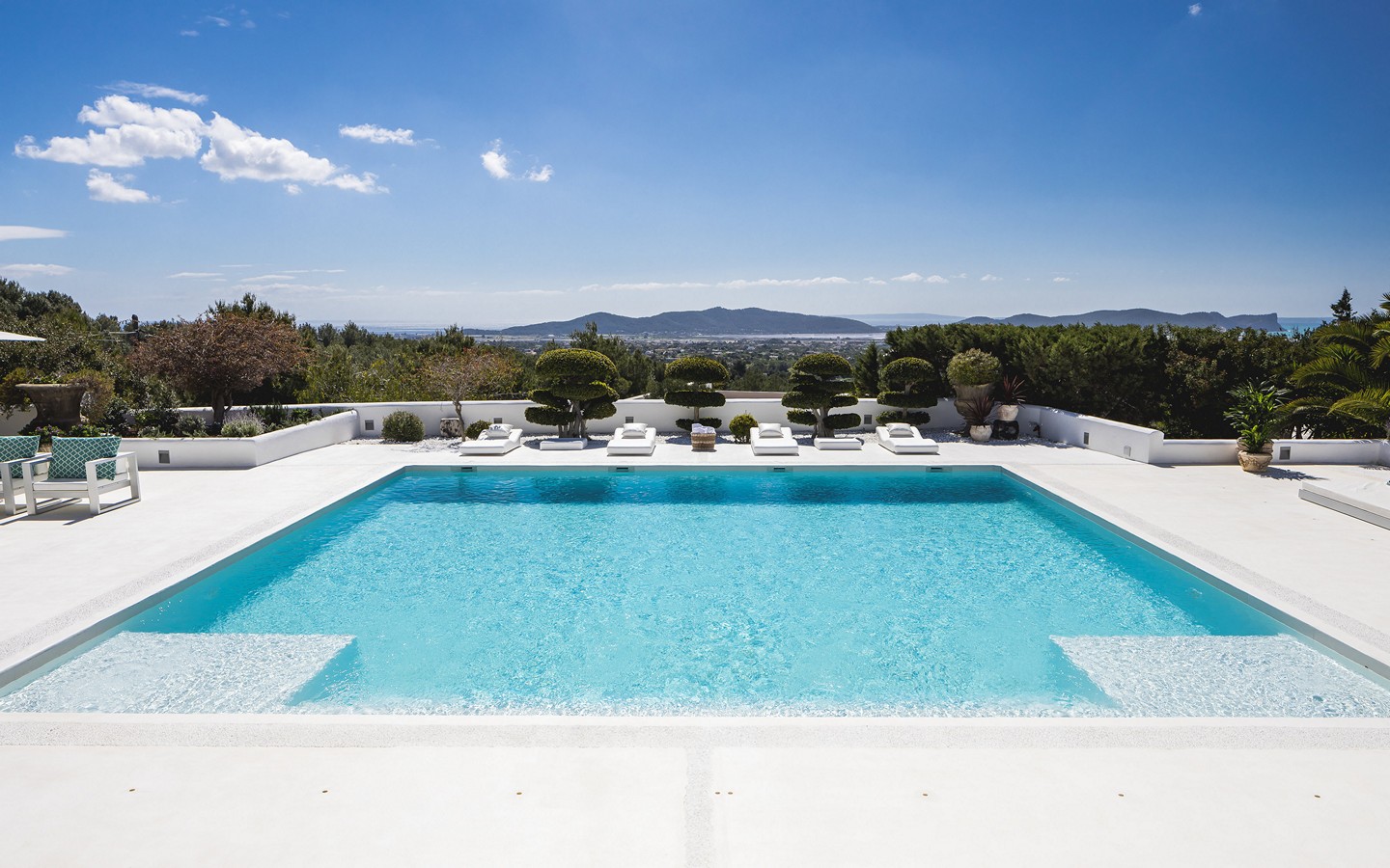 In a panoramic position on the hills of Ibiza, Villa Amy is perfect for those looking for a quiet location just a few kilometers from the most beautiful beaches of the island. The villa has modern finishes and large windows that make the structure very bright. The villa is divided into two areas: the main house and the annex. The main house, of 450 square meters, consists of a large living room with TV, dining table and sofa, a complete kitchen, four bedrooms and four bathrooms. The annex, of 120 square meters, is composed instead of two other bedrooms and a bathroom. The property offers many amenities such as: air conditioning, alarm, wi-fi, gym, an outdoor pool (10×10), outdoor barbecue and various solarium areas where you can relax and enjoy the beautiful sea view. The city center of Ibiza is 7 km away.