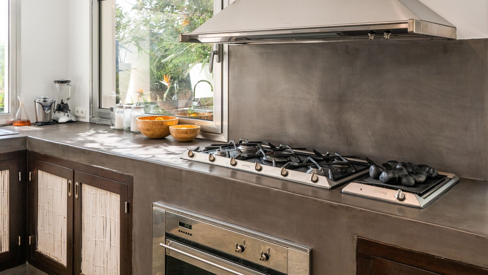 Surrounded by palm trees, our villa has an ample entrance, where you can find the parking in the corner nearby. Snow white villa Can Sakay is modern and simple to please your eyes. The living room is magical, equipped with a black sofa decorated with brown and white cushions and a wooden coffee table. Big pictures on the wall are a minimalistic decoration which give the villa a beautiful contrast with the high ceilings. The kitchen is spacious; the breakfast bar gives additional seating for a quick ‘bite to eat’ or morning coffee before those adventurous days visiting all Ses Salines has to offer. A formal dining area for that quiet evening in is located just to the front of the sofa.