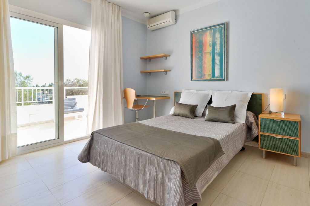 This modern and recently built villa is situated in Jesus, very close to Ibiza center. The outside area is large, with parking, beautiful garden, barbecue and swimming pool divided by zone, where it’s been installed a Jacuzzi. The villa has 2 levels, at the ground floor there is a big and modern kitchen with direct access to the garden, a bright living room with dining area, two double bedrooms and two bathrooms. At first floor there are two double bedrooms with bathroom and hydro-massage tub. The villa has WI-FI internet connection and air conditioned.